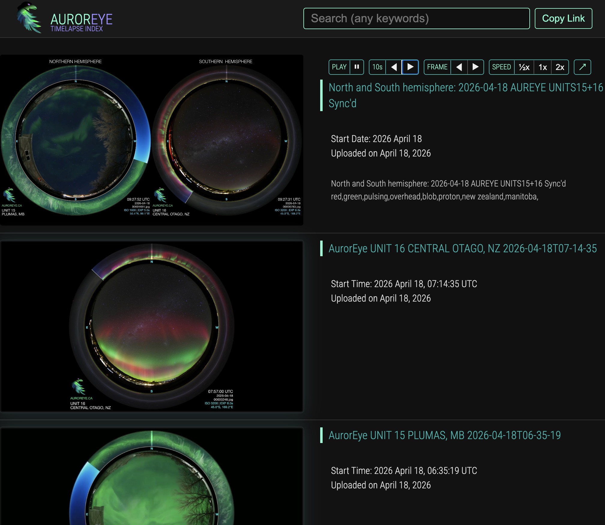 AurorEye timelapse videos are hosted on a dedicated YouTube channel at 4K resolution with radial keograms. If you are a student, citizen, scientist or research interesting in the content of these timelapses, please get in touch at jeremy@jufaintermedia.com
